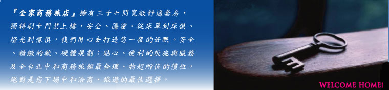 『全家商務旅店』擁有五十間寬敞舒適套房,獨特刷卡門禁上樓,安全、隱密。從床單到床俱、燈光到傢俱,我們用心去打造您一夜的好眠。